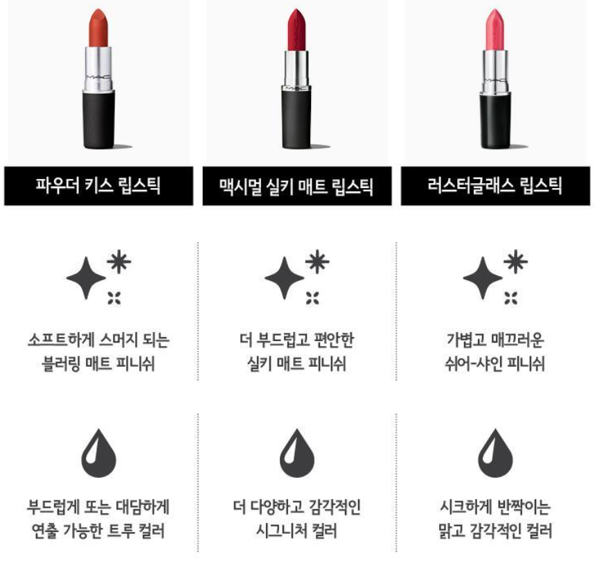 나의 20대 선배 언니들의 화장 기술이 신기하기도 하고 기숙사 생활하며 많이 배우며 이것저것 따라 해 본 기억이 난다. 선배들의 화장품 중 비싼 립스틱 중 하나였던 맥(Make-up Art Cosmetic)은 전문가 등급의 화장품으로 유명한 인기 있는 화장품 브랜드이다. 추석 때였나 세일 기간이라 하나 사본 기억이 났다. 그 발색과 느낌이 정말 좋아서 아주 아껴서 썼다. 그때는 쨍하고 화려한 색감이 유행이었다면 지금은 톤 다운되고 분위기를 더 잘 살릴 수 있는 컬러들이 인기가 많은 거 같다 유튜브나 인스타에 다양한 화장법을 소개해 주는 것들이 많아서 살펴보면 맥이란 그랜드는 꼭 하나씩 들어있다. 다음은 맥 브랜드의 다섯 가지 주요 특징이다. 맥은 다양한 피부톤과 색조에 맞춘 광범위하고 포괄적인 파운데이션 색조로 유명하다. 다양성에 대한 이러한 헌신으로 인해 많은 메이크업 아티스트와 소비자들이 즐겨 찾는 브랜드가 되었다. 그리고 원래 전문 메이크업 아티스트를 위해 개발된 맥 제품은 고성능을 위해 제작되어 오랜 착용감을 제공하며 사진 촬영, 패션쇼 및 스크린에서 자주 사용된다. 내가 약간 고민하던 부분이 있는데 특징이자 단점이라고 볼 수 있는 MAC 제품, 특히 립스틱, 아이섀도, 파운데이션은 색소침착이 높은 것으로 알려져 있다. 이것은 색상이 선명하고 오래 지속되며 대담한 외관을 위해 최소한의 사용으로도 발생이 잘되니 참고하기 바란다. 맥은 뷰티 산업에서 트렌드를 설정하는 것으로 명성이 높다. 특히 계절별 컬렉션과 유명 인사, 디자이너, 그리고 인플루언서들과의 협업은 전 세계적으로 인기를 끄는 새로운 색상과 스타일을 소개한다. 뜨거운 여름이 가고 가을을 맞아 립스틱 컬러 여러 가지 비교해 보고 나에게 맞는 컬러 선점해 보자.