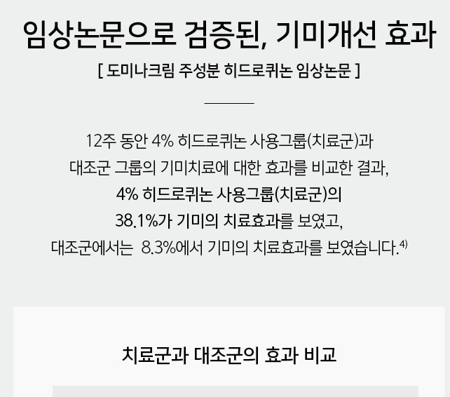 이제 기미와의 전쟁을 선포하려고 한다. 피부과 안 간 지 정확히 8개월 차 솔직히 홈케어에 집중해서인지 특별히 더 진해졌다는 느낌은 없다. 하지만 이걸 유지하려니 대책이 필요했다. 지금 사용한 지 4주 차이고 확실히 밝아짐을 느껴서 급히 포스팅해 본다. 내가 아는 도미나 크림은 연령대가 높은 분들이 사용할 거 같고 좀 자극적일 거 같다고 생각했다. 하지만 직접 발라보니 괜한 걱정이었다. 자기 전 듬뿍 바르고 자는데 처음엔 긴장했다 아무래도 제약회사 제품이다 보니 걱정과 신뢰가 함께 느껴졌다. 결과론적으로 훌륭한 선택이었다. 오늘은 공식 홈페이지에서 가져온 사진이 많을 텐데 내가 아무리 이야기한다고 해도 임상실험 결과를 무시할 수 없고 눈으로 확인해 보기를 권한다.