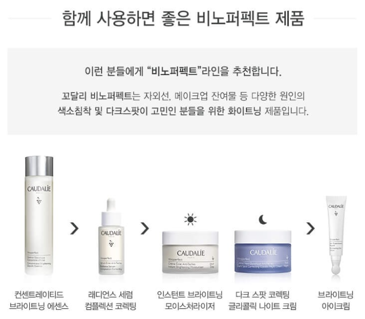 다음은 카우달리 화장품의 다섯 가지 특징이다. 첫 번째 포도를 기반으로 한 성분, 특히 레스베라트롤과 포도 씨 폴리페놀을 특징으로 한다. 이러한 산화 방지제는 활성산소와 싸우고 피부 건강을 증진하는 것을 돕는 항노화 및 보호 특성으로 알려져 있다. 두 번째 자연적이고 환경친화적인 재료를 사용하는 것을 자랑한다. 꼬달리는 제품들은 파라벤, 프탈레이트, 미네랄 오일, 합성 향료가 없어서 민감한 피부를 가진 사람들에게 알맞고 나도 그래서 만족하는 부분이다. 세 번째 지속 가능성과 친환경 실천에 전념하고 있다. 환경 친화적인 포장을 사용하고 운영에서 탄소 중립을 위해 노력하는 등 환경 발자국을 줄이기 위한 다양한 방법을 모색하고 있다. 네 번째 잔인함이 없는 브랜드인데, 이것은 동물에게 자신들의 제품을 실험하지 않는다고 한다. 또한 동물 실험이 법으로 요구되는 시장에서는 자신들의 제품을 팔지 않는다. 얼마 전 토끼에게 마스카라 제품을 수십 또는 수백 법씩 실험하는 내용의 글을 보면 안타까웠는데 꼬달리는 좋은 방향을 제시 하는 것 같다. 마지막으로 천연 성분을 강조하는 반면, 제품 개발에 과학적인 연구로 노력한다. 효능과 안전을 보장하기 위해 피부관리 분야의 연구자들 및 전문가들과의 협력의 결과이다. 이는 유세린 개발자들과 흡사한 부분인 것 같다. 그렇다면 내가 가장 좋아하는 세럼에 대해 소개해 보고자 한다. 이름은 비노퍼펙트 래디언스 세럼인데 대부분 래디언스 세럼이라고 하면 이해한다. 이 세럼은 15년 연속 프랑스 안티 다크 스팟 1위를 차지하고 있으며 미백 기능성 인증받았다. 비노퍼펙트 래디언스 세럼 컴플렉션 코렉팅은 다크 스팟을 완화하고 빛나는 광채 피부로 가꾸어 주는 꼬달리 베스트 화이트닝 세럼이다.