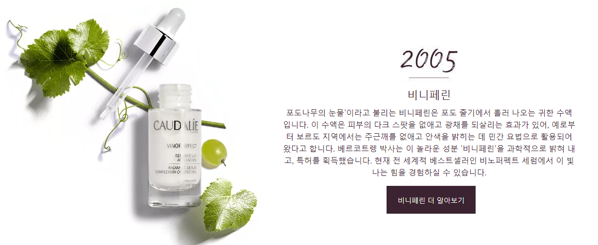 꼬달리 화이트닝에 관심이 있다면 한 번쯤은 들어 보았을 브랜드이다. 나는 이 제품을 사용한 지 7년 차인데 중간중간 미백에 좋다는 화장품도 여러 개 사용해 보았지만 이 제품은 꾸준히 항상 쓰게 된다. 다른 제품을 아침에 쓴다면 꼬달리는 저녁에 자기 전이라도 꼭 사용한다. 그 이유는 주위에서의 반응이다. 얼굴이 밝아졌다. 안색이 좋아졌다. 라는 칭찬을 들으면 내심 꼬달리 덕분인가 싶기도 하고 홈쇼핑의 강국인 만큼 한 번에 대량으로 많이 구입해 두고 아껴 쓰고 있다. 여러가지로 가성비가 좋다. 지금부터 꼬달리에 대해 좀 더 알아보자. 꼬달리(Caudalie)는 포도에서 추출한 성분을 사용하는 유명한 스킨케어 브랜드이다.