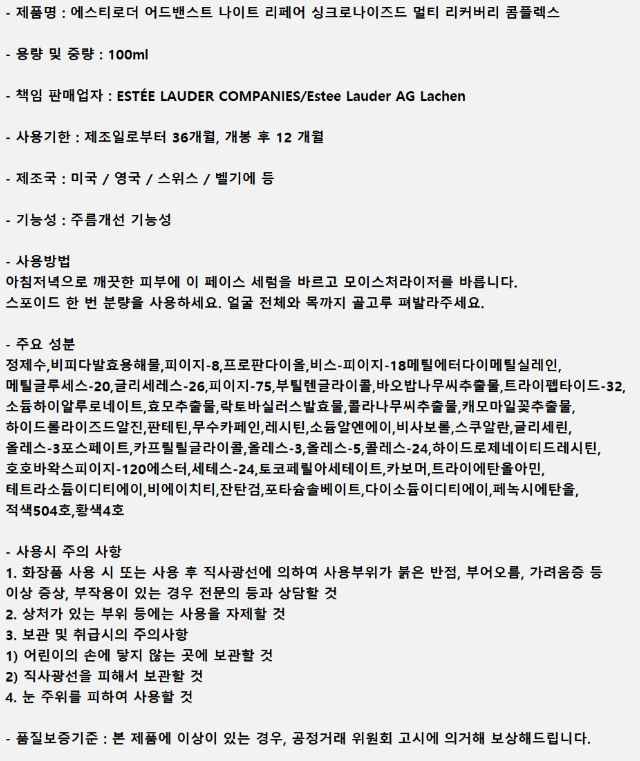내 주위에서만 봐도 면세점에서 가장 많이 구입하고 대부분 만족하고 사용하는 것 같다. 그래도 처음부터 용량을 큰 거 사지 말고 작은 사이즈로 사용해 보고 결정하길 바란다. 공식 사이트에서 나는 주로 구매하는데 그 이유는 세트할인이 많이 되고 신뢰성을 중요시하기 때문이다. 그리고 피부고민별로 추천 상품들이 있어 아주 유용하다. 잔주름이 많을 나이는 아직 아니라서 크게 좋아졌다는 느낌은 사실 없지만 오랜 여행으로 피부가 지쳤을 때 확실히 나이트 케어 세럼을 사용해 주면 쫀쫀함과 부드러움을 느낀다. 아래의 내용은 공식홈페이지의 설명글이다. 25% 더 빨라진 노화 개선 효과가 있다. 미세 주름부터 굵은 주름까지 25% 더 빠르게 주름을 개선해 준다. 어드밴스드 나이트 리페어 싱크로나이즈드 리커버리 콤플렉스Ⅱ 4주 사용 대비, 개인차 있음. 72시간 피부 수분 잠금 효과가 있고 강력한 히알루론산 성분을 담아 피부 속 수분을 72시간 가둬두어 더 생기 있고 촉촉하게 빛나는 피부를 유지한다고 한다. 오랜 시간 지속되는 강력한 항산화 보호 효과가 있고 다양한 외부 유해 환경으로 인한 눈에 띄는 손상으로부터 피부 보호 한다고 한다.-출처스킨케어/에센스&세럼(안티-에이징) 부문, 보떼 리서치 2012년-2022년 11년 간 아시아 7개국 통합 리포트 (백화점&부띠끄 채널, 판매금액 기준) 보떼 리서치 SARL에서 2023년 2월 아시아 7개국 통합 리포트 분기별 리테일 세일즈 리포트 2022 내 백화점/부띠끄 프레스티지 시장 부문에서 발표한 데이터에 일부 근거하였다. (Copyright ©2023 Beauté Research SARL)