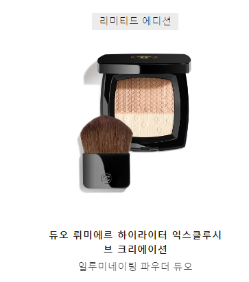 쉽게 말해 치크나 포인트 하이라이터이다. 제품명은 듀오 뤼미에르이다. 팔레트 표면을 장식한 시퀸 모티프를 그대로 새겨 넣은 일루미네이팅 파우더 듀오를 만나보자. 핑크 샴페인과 크리스털 화이트는 눈부시게 빛나는 가브리엘 샤넬의 1920년대 작품을 떠올리게 하며, 투명한 광채로 얼굴을 환하게 밝혀준다. 일루미네이팅 파우더 듀오는 1920년대 가브리엘 샤넬이 공개한 화려한 작품을 연상시키는 시퀸 모티프가 새겨져 있다. 밝고 관능적인 핑크 샴페인과 크리스탈 화이트 컬러는 실크처럼 은은하게 빛나는 광채로 얼굴을 환하게 밝혀줍니다.